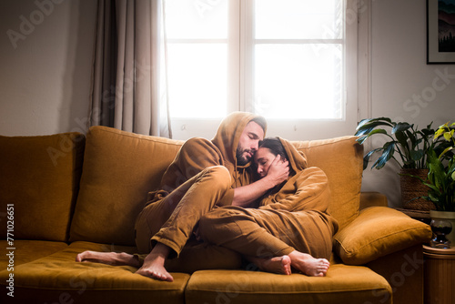 Affectionate couple merged with sofa