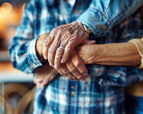 Affectionate elderly woman lovingly supports mature husband in heartfelt moment at home