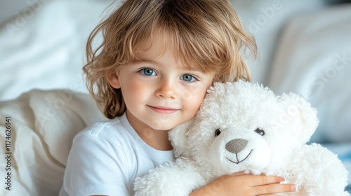 Affectionate Little Boy Embracing His White Bear Companion Indoors