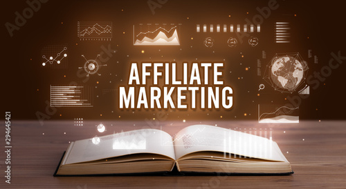 AFFILIATE MARKETING inscription coming out from an open book, creative business concept