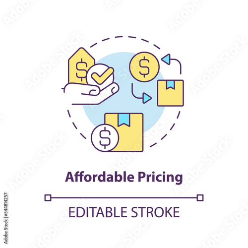 Affordable pricing concept icon. Cheap postal services. Low cost delivery. Shipping abstract idea thin line illustration. Isolated outline drawing. Editable stroke. Arial, Myriad Pro-Bold fonts used