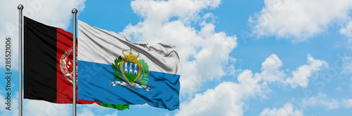 Afghanistan and San Marino flag waving in the wind against white cloudy blue sky together. Diplomacy concept, international relations.