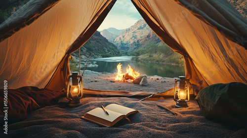 A-Frame canvas tent interior with vintage journal and warm lanterns at sunrise, panoramic view of secluded canyon campsite near flowing river,