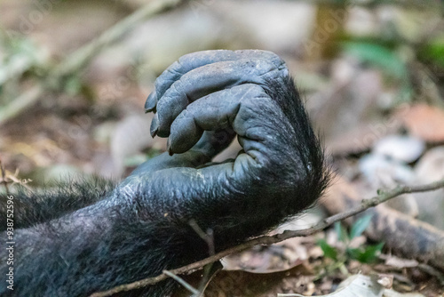 Africa, Uganda, Kibale Forest National Park. Chimpanzee (Pan troglodytes) in forest. Hands, fingers. 2016-08-04