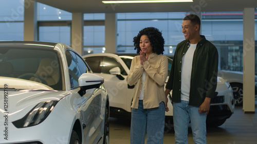 African American affectionate couple buyers customers man woman at auto salon showroom rent transport service happy joyful male female husband wife choosing buying luxury electric car buy automobile
