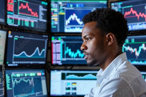 African American Auditor Surrounded by Vibrant Screens Showing Electronic Spreadsheets