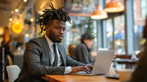 African american black businessman with dreads wearing suit is sitting at a table in coffee shop and working on his laptop