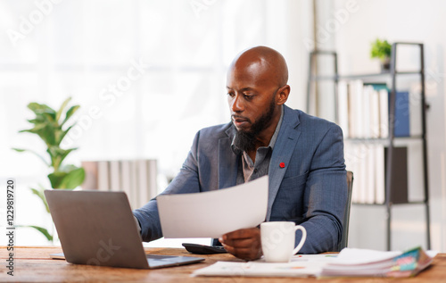 African American business man Accounting using calculating income-expenditure and analyzing real estate investment data report Financial and tax systems concept.