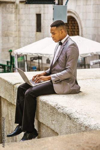 African American Businessman traveling, working in New York. Wearing gray blazer, bow tie, a college student siting on street, looking, reading, working on laptop computer. Filtered effect..