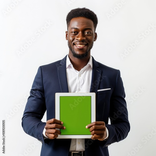 African American CEO showcasing green screen tablet for mobile app.