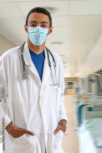 African American doctor with mask hans on his pockets in hospital corridor