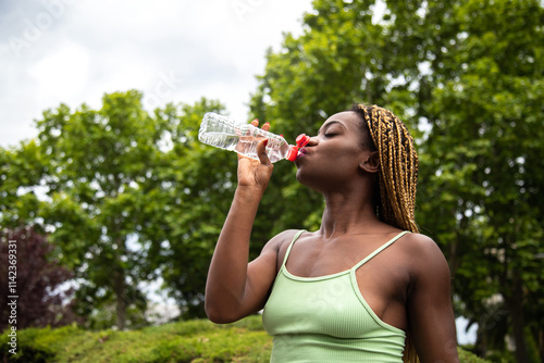 African American female jogger taking a break to hydrate. Woman drinking water after exercising and running outdoors.