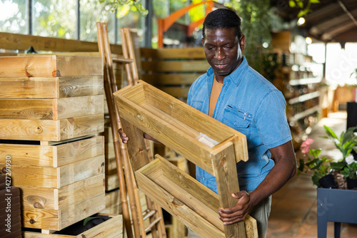 African american gardener, standing in a warehouse in a flower greenhouse, attentively examines a rack of pallets for planting flower sprouts