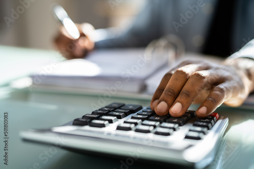 African American Male Accountant Using Calculator