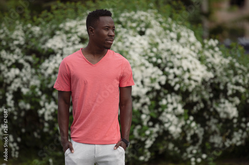 African american man in living coral color empty t-shirt standing near bush outdoor, mockup