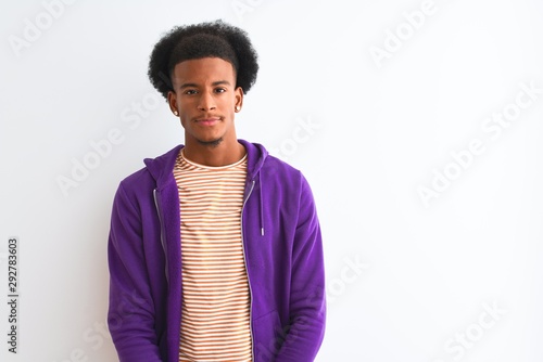 African american man wearing purple sweatshirt standing over isolated white background with serious expression on face. Simple and natural looking at the camera.