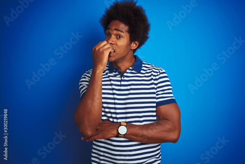 African american man with afro hair wearing striped polo standing over isolated blue background looking stressed and nervous with hands on mouth biting nails. Anxiety problem.
