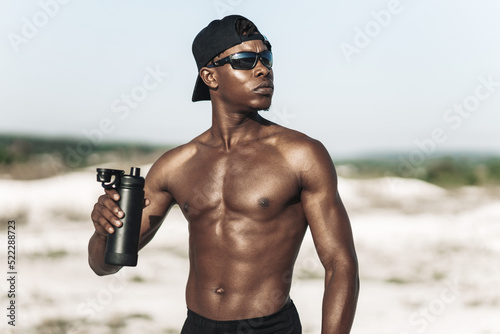 African American man with toned body holding bottle of refreshing water relaxing after workout outdoors