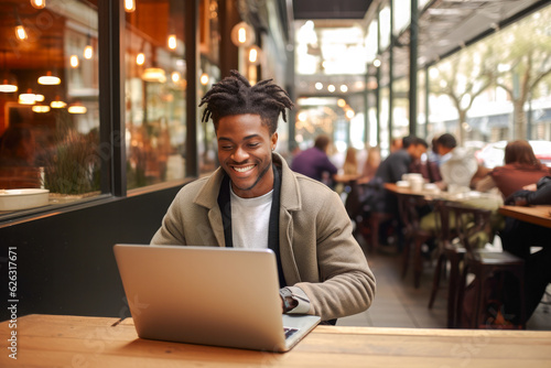African American man working on a laptop computer in a busy cafe, a portrait of a successful person