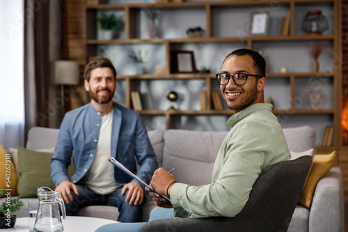African American psychologist doctor with a patient client, looking at the camera and smiling while sitting in a chair in his stylish office. Seeing a psychologist or psychotherapist.