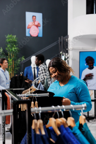 African american shopaholic woman shopping for casual wear in modern boutique, checking merchandise fabric. Stylish customer wanting to buy new fashion collection in clothing store