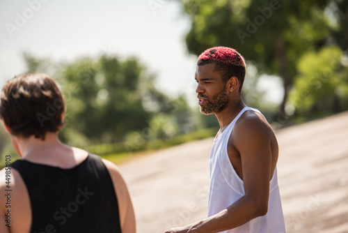 African american sportsman talking near blurred friend outdoors