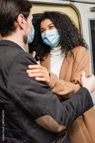 african american woman in medical mask hugging with boyfriend in subway