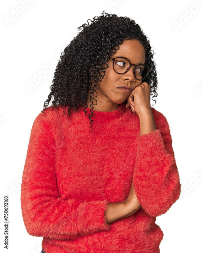 African American woman in studio setting who feels sad and pensive, looking at copy space.