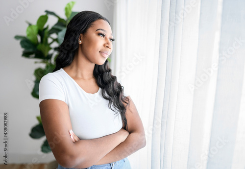 African American woman looking to aside out window, standing at home
