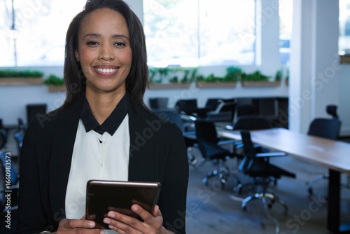 African American woman smiling with tablet in office with swivel chairs table plants, copy space