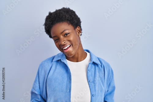 African american woman standing over blue background smiling cheerful with open arms as friendly welcome, positive and confident greetings