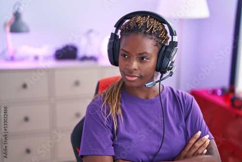 African american woman streamer sitting with arms crossed gesture at gaming room