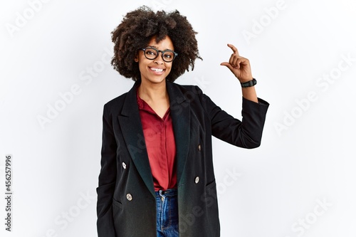 African american woman with afro hair wearing business jacket and glasses smiling and confident gesturing with hand doing small size sign with fingers looking and the camera. measure concept.