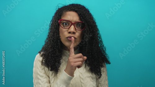 African american woman with curly hair holds finger to lips for silence in teal studio setting; silence.