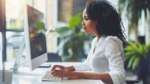 African American woman working at a computer in a cozy, plant-filled room with warm lighting. Represents creativity and a comfortable work setting.