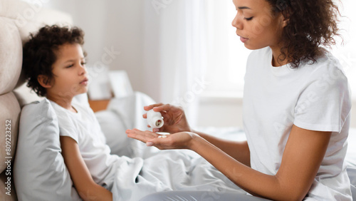 African American young boy, looking unwell and seated on a bed, receives medication from a caring woman, who is gently offering him a bottle of medicine and a spoonful to help him get better.