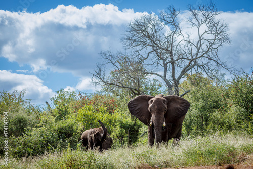 African bush elephant with cub in green savannah in Greater Kruger National park, South Africa ; Specie Loxodonta africana family of Elephantidae