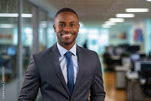 African businessman smiling with big room office as background, Generative Ai