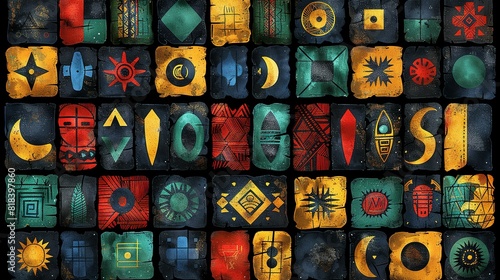 African clash ethnic tribal seamless pattern background. Vector red, yellow, green symbols, square repeat lines backdrop for Black History Month, Juneteenth, Kwanzaa print, banner, wallpaper