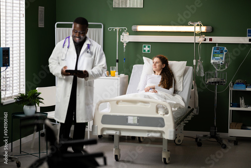 African doctor leaves hospital ward with tablet in hands conducted consultation for young patient in bed.