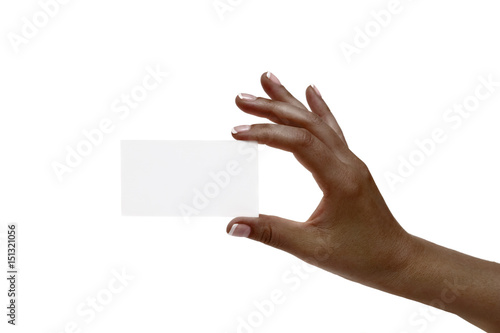 African female hand holds white card on a white background.