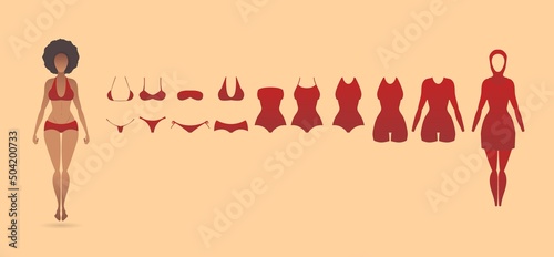 African girl with a set of bikini and swimwear. Constructor. Vector.