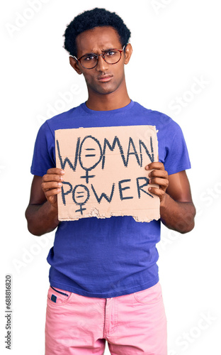 African handsome man holding woman power banner thinking attitude and sober expression looking self confident