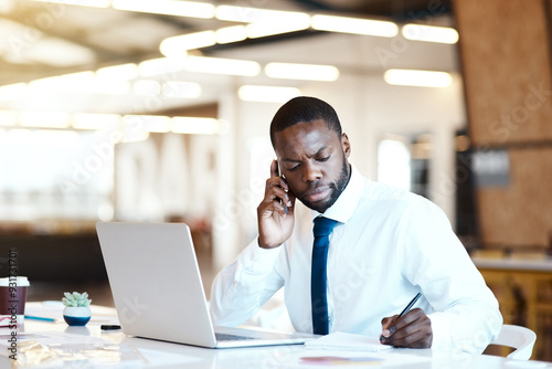 African man, phone call and laptop as manager, employee and accountant in finance company. Male person, tech and notes for investment, project or portfolio for tax review, development and opportunity