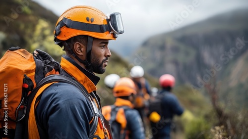 African men in rescue unit uniforms, engaged in a coordinated rescue operation, using specialized tools and working alongside other first responders.