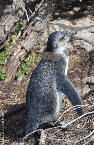 African new born baby penguin (Spheniscus demersus) on Boulders Beach near Cape Town South Africa relaxing in the sun