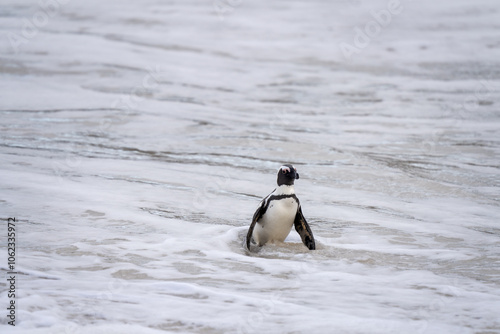 African penguin on the Boulders beach. Endangered species of penguin in Africa. Funny penguins are playing in the waves.