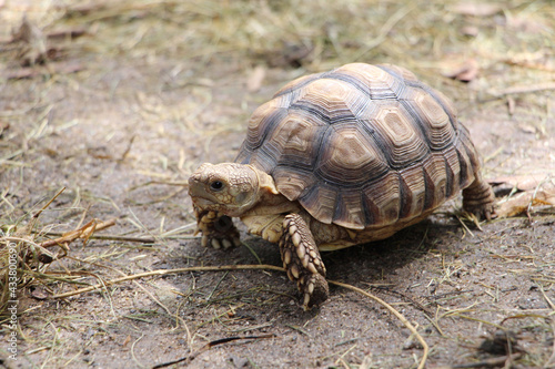 African Sulcata Tortoise Natural Habitat,Close up African spurred tortoise resting in the garden, Slow life ,Africa spurred tortoise sunbathe on ground with his protective shell ,Beautiful Tortoise