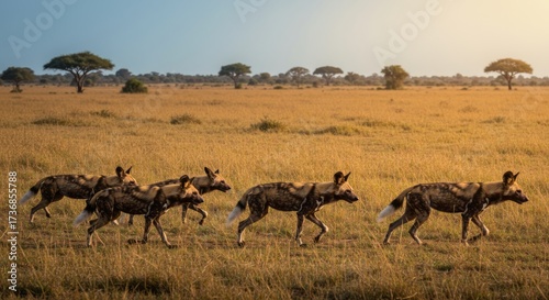 African wild dog standing on savanna, endangered predator with unique patterned fur, perfect for wildlife, safari, and conservation themes.