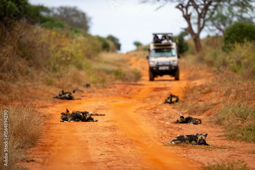 African wild dogs rest on a dirt road as a safari vehicle approaches in a wildlife reserve. Taita-Taveta, Kenya